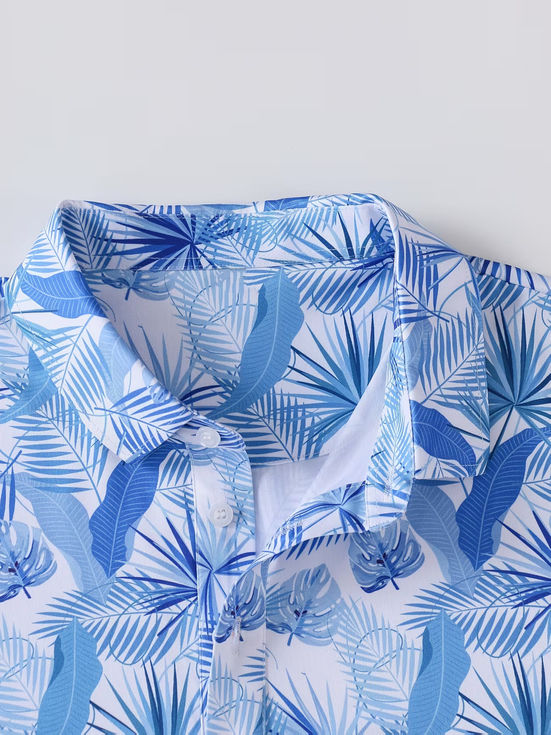 Crisp white base. Layered with palms, fronds, and tropical leaves in soft powder blue, sky blue, and deeper ocean tones. The overlapping foliage creates depth without feeling busy. It’s airy, light, and effortlessly fresh.